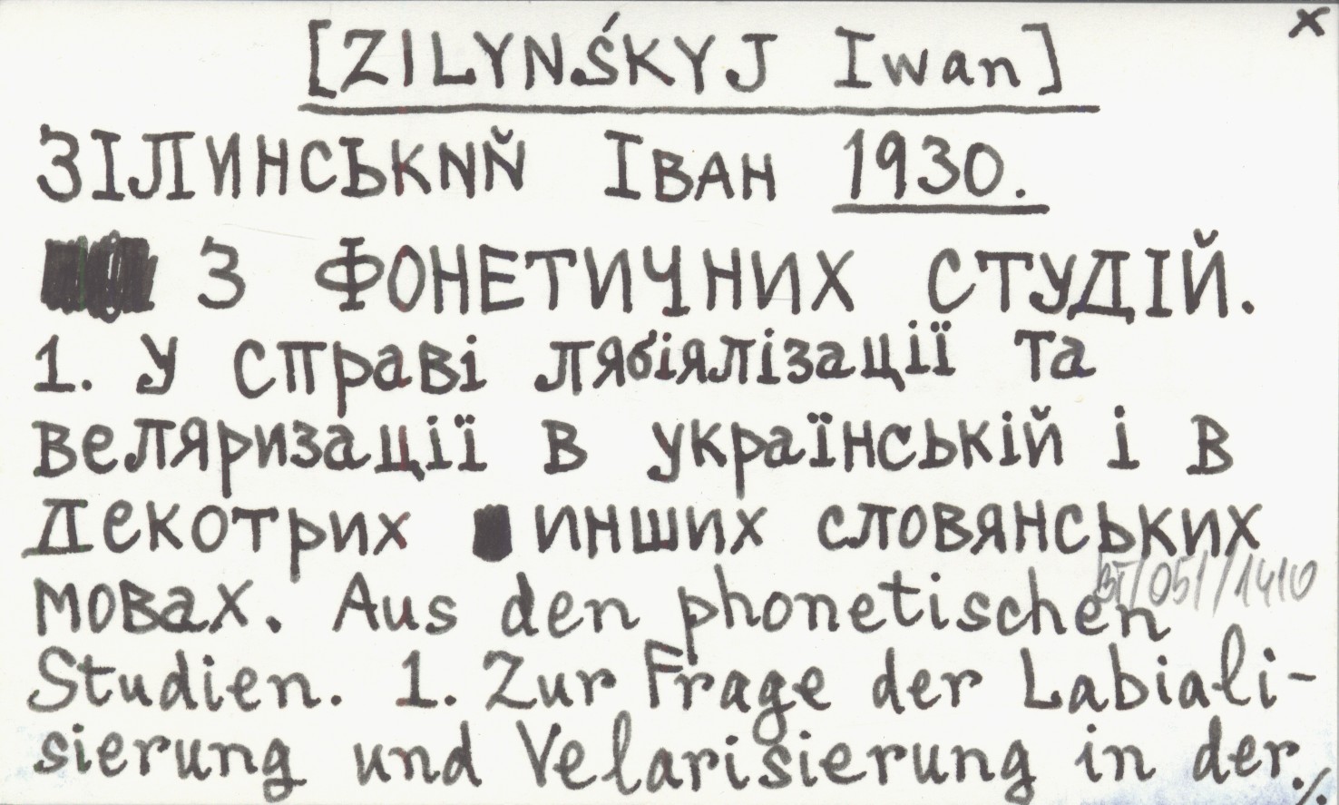 [ZILYNŚKYJ Iwan] 1930 Z fonetičnich ctudij. 1. U spravi ljabijalizacii ta veljarizacii v ukrainskij i v dekotrich inšich slovjans'kich movach. Aus den phonetischen Studien. 1. Zur Frage der Labialisierung und Velarisierung in der ukrainischen und einigen anderen slavischen Sprachen.