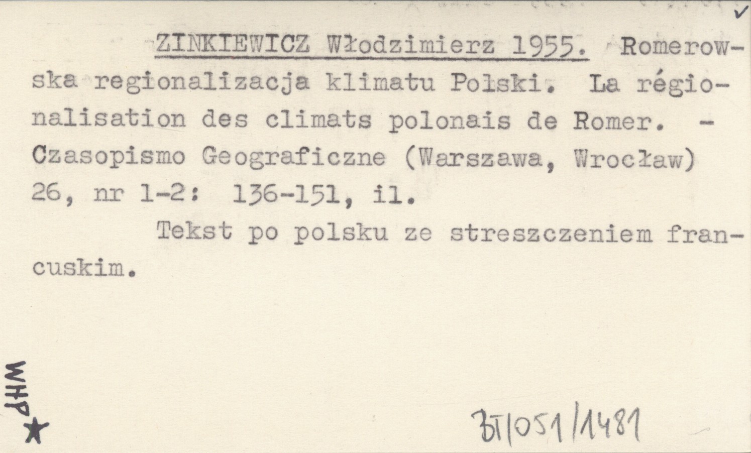 ZINKIEWICZ Włodzimierz 1955 Romerowska regionalizacja klimatu Polski. La régionalisation des climats polonais de Romer.