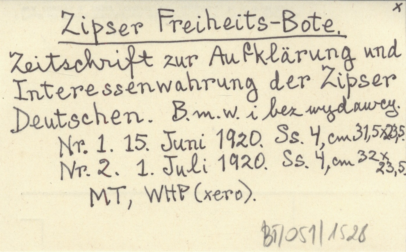 Zipser Freiheits-Bote, Nr 1 (15. Juni 1920), 4 s. ; nr 2 (1. Juli 1920), 4 s. ; 32x24 cm. Zeitschrift zur Aufklärung und Interessenwahrung der Zipser Deutschen.