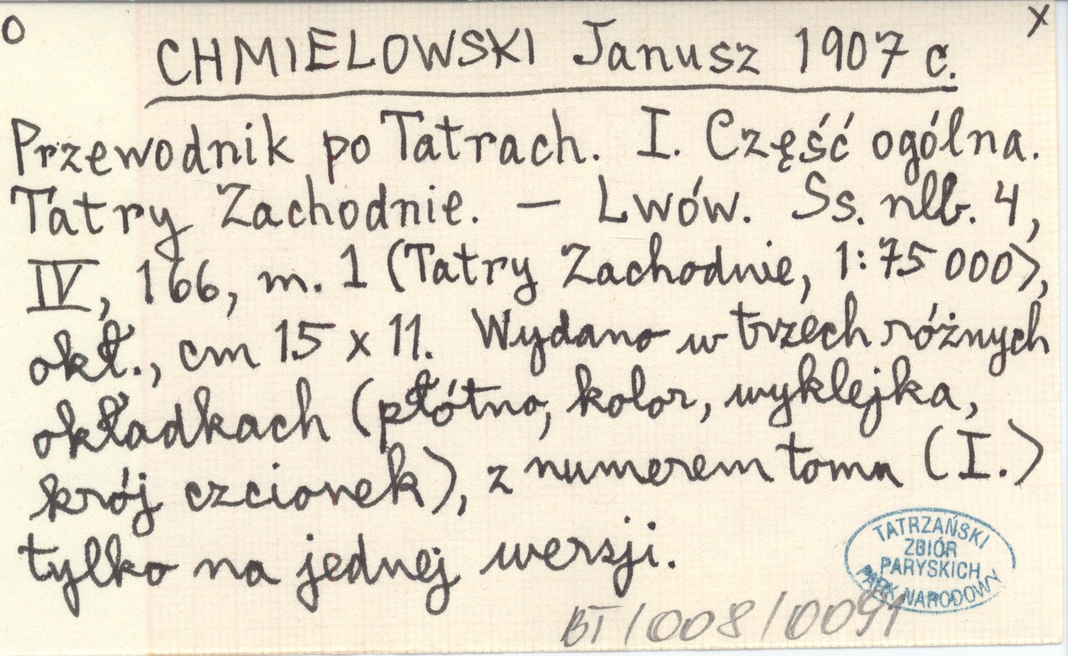 Lwów , [4], IV, 166 s., 1 mapa, okł., 15x11 cm. Mapa: Tatry Zachodnie 1:75 000. Wydano w trzech różnych okładkach (płótno, kolor, wyklejka, krój czcionek), z numerem tomu (I.) tylko na jednej wersji.