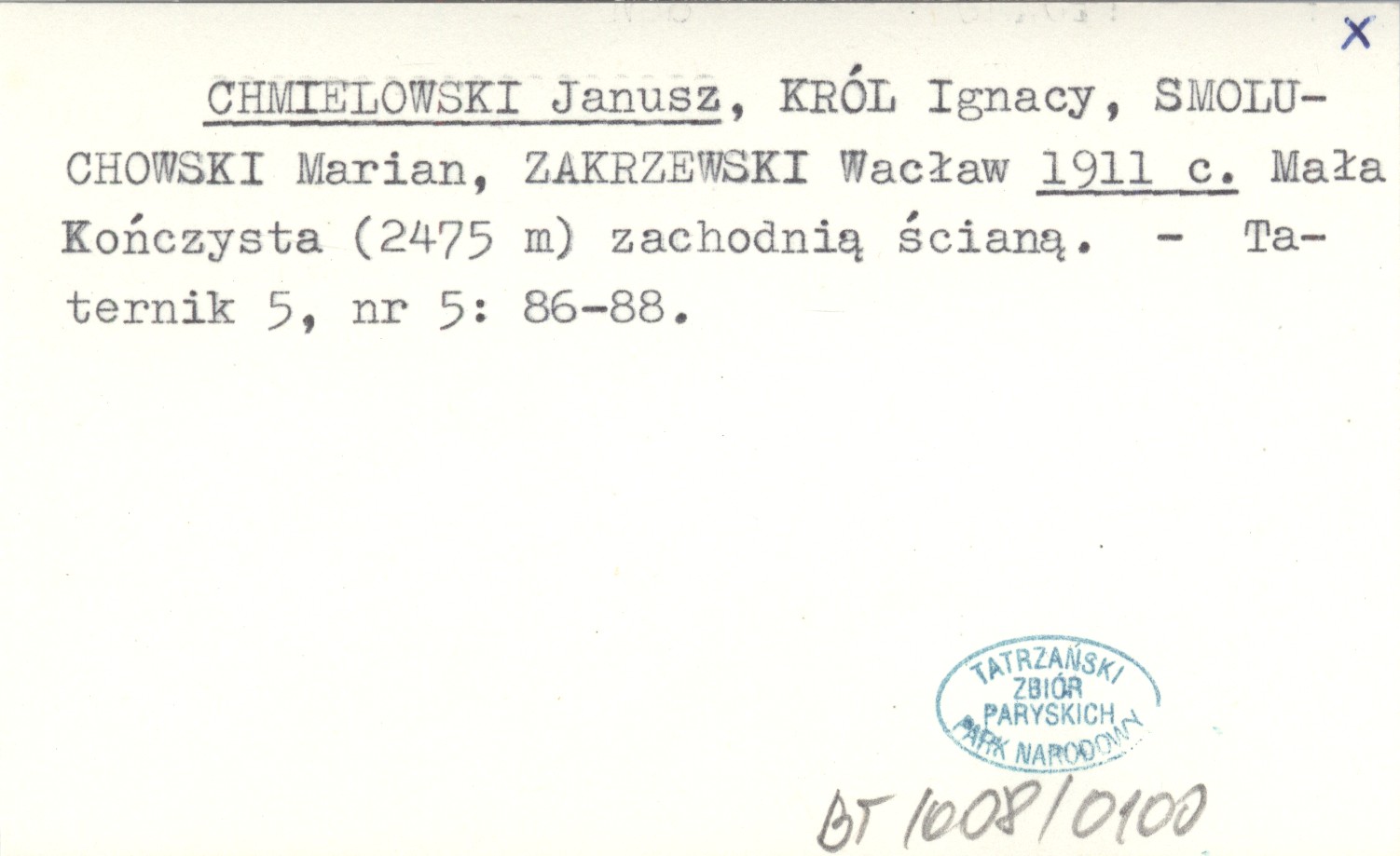 CHMIELOWSKI Janusz KRÓL, Ignacy. ; SMOLUCHOWSKI, Marian. ; ZAKRZEWSKI, Wacław. ; 1911 c Mała Kończysta (2475 m) zachodnią ścianą.