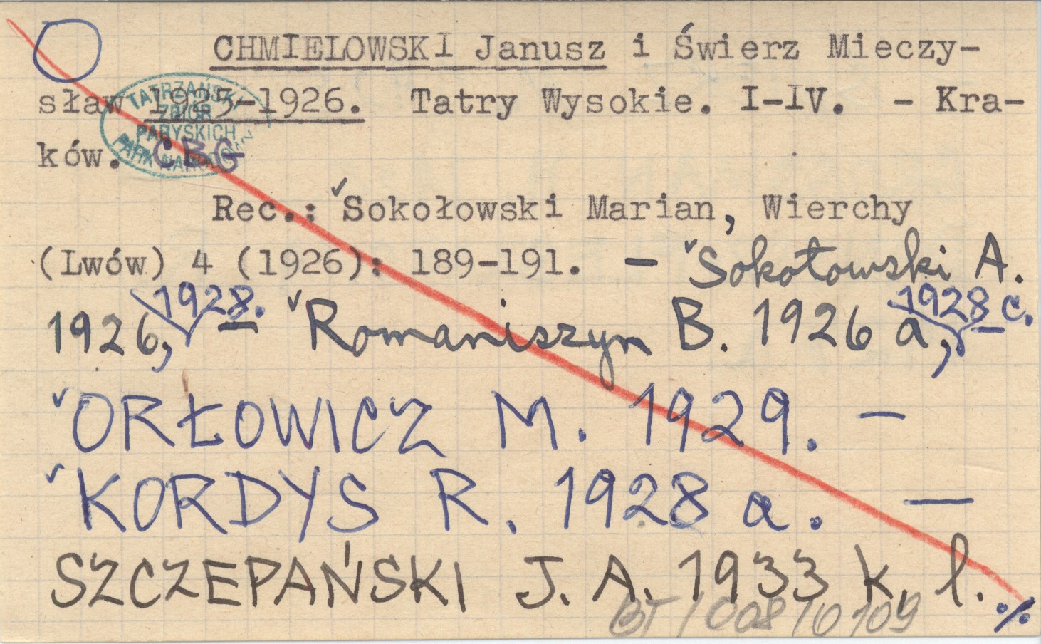 Kraków , REC: SOKOŁOWSKI Marian, Wierchy (Lwów) 4 (1926): 189-191 ; SOKOŁOWSKI A. 1926, 1928 ; ROMANISZYN B. 1926 a, 1928 c ; ORŁOWICZ M. 1929 ; KORDYS R. 1928 a ; SZCZEPAŃSKI J. A. 1933 k, l ; ŚWIERZ M. 1925 an ; GROSSMAN H. 1925... ; DANYSZ-FLESZEROWA R. 1927 a ;