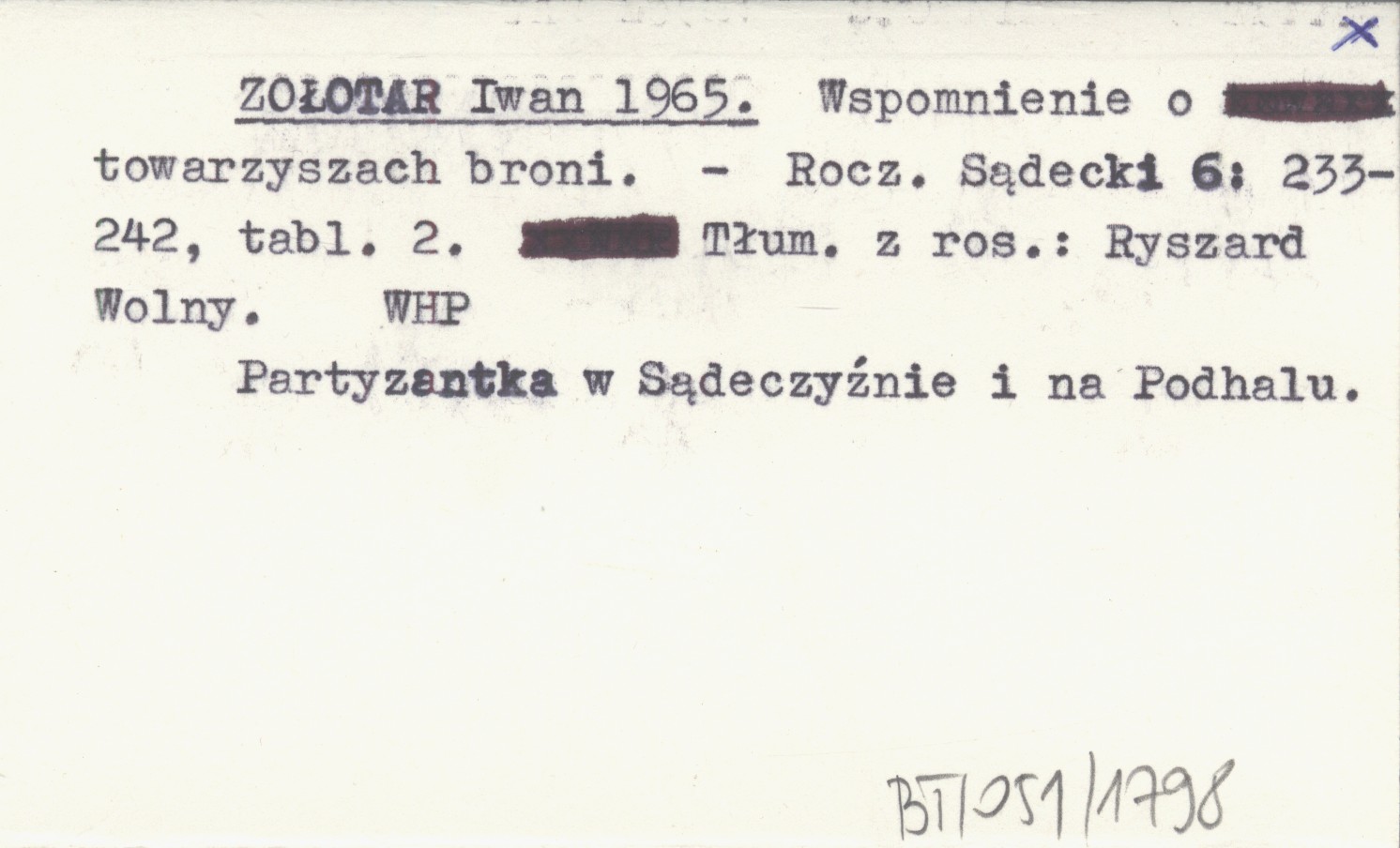 Rocznik Sądecki, 6: 233-242, 2 k. Partyzantka w Sądeczyźnie i na Podhalu. Tłumaczenie z rosyjskiego: Ryszard Wolny.