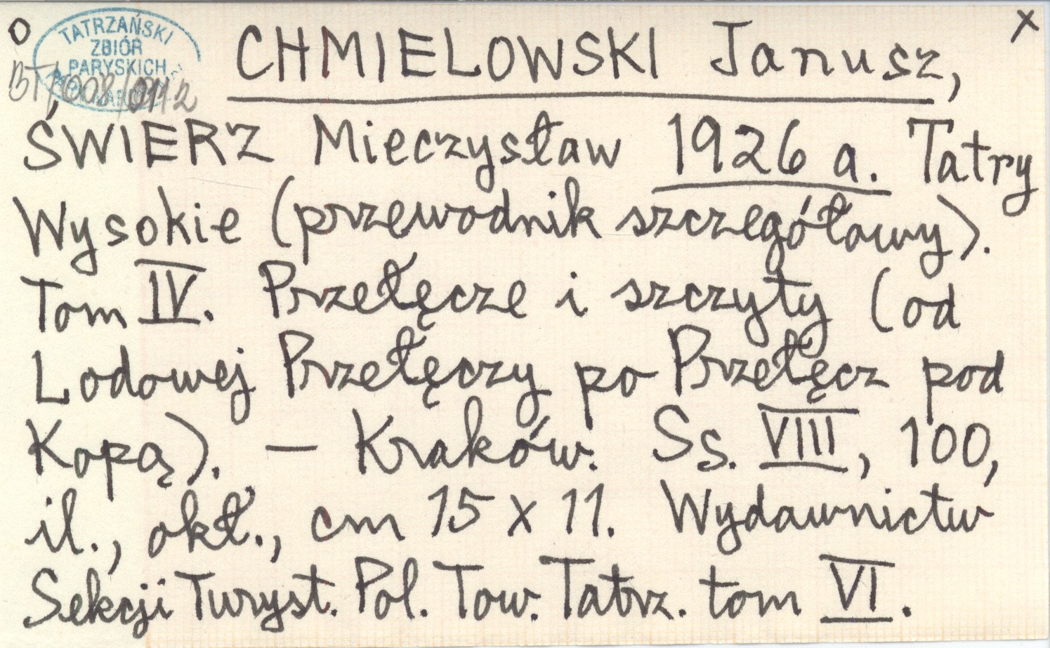 CHMIELOWSKI Janusz ŚWIERZ, Mieczysław. ; 1926 a Tatry Wysokie (przewodnik szczegółowy). Tom IV. Przełęcze i szczyty (od Lodowej Przełęczy po Przełęcz pod Kopą).