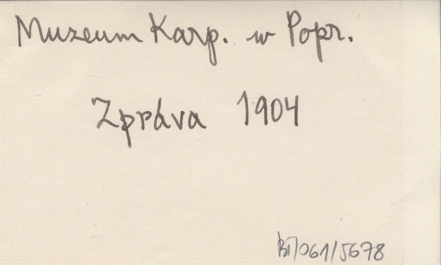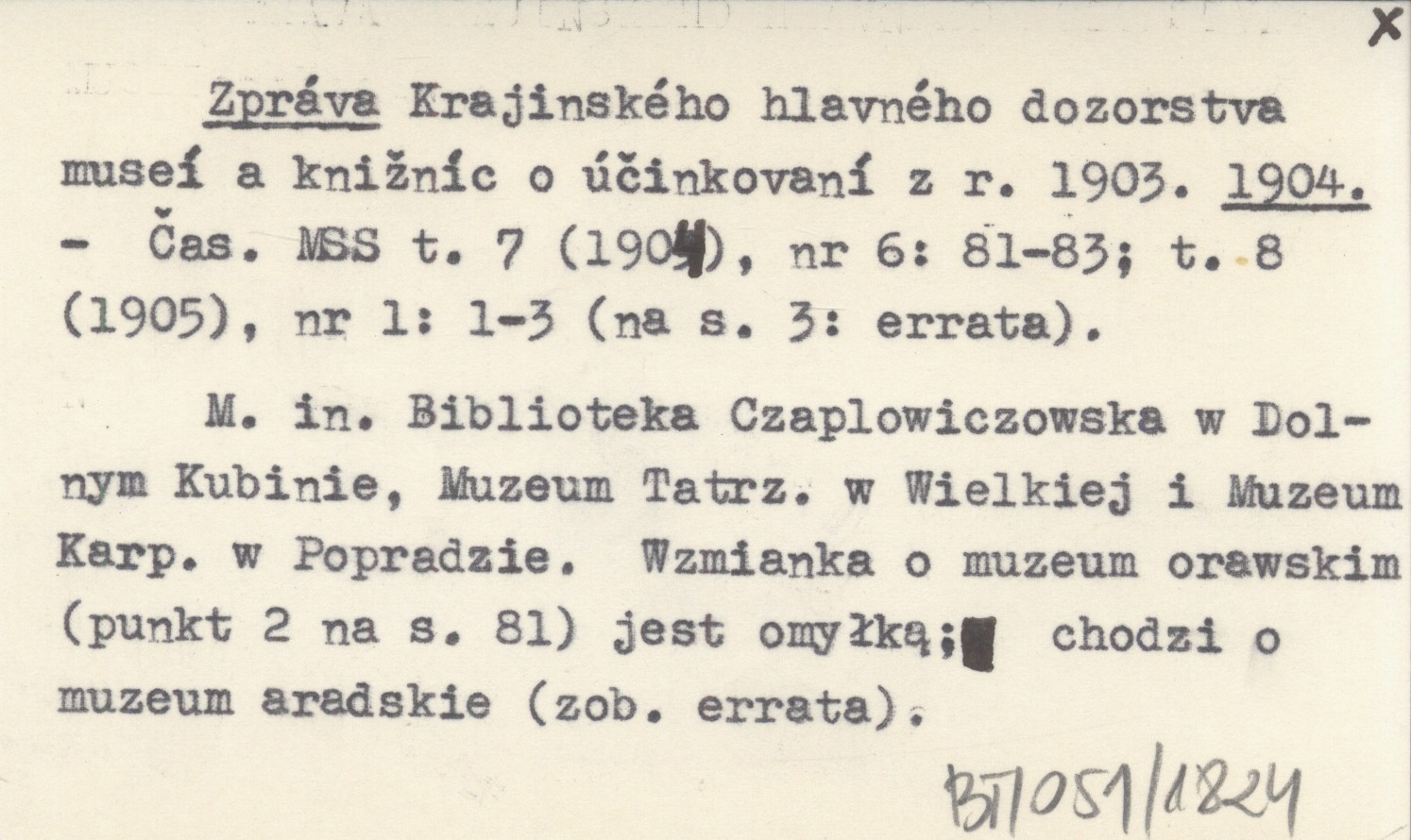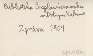 Časopis Muzeálnej Slovenskej Spoločnosti, T. 7 (1904), nr 6: 81-83 ; t. 8 (1905), nr 1: 1-3, err. (na s. 3). M. in. Biblioteka Czaplowiczowska w Dolnym Kubinie, Muzeum Tatrzańskie w Wielkiej i Muzeum Karpackie w Popradzie. Wzmianka o muzeum orawskim (punkt 2 na s. 81) jest omyłką: chodzi o muzeum aradskie (zob. err.).