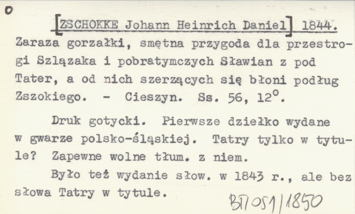 Cieszyn , 56 s., 12°. Tatry tylko w tytule? Druk gotycki. Pierwsze dziełko wydane w gwarze polsko-śląskiej. Zapewne wolne tłumaczenie z niemieckiego. Było też wydanie słowackie w 1843 r., ale bez słowa Tatry w tytule.