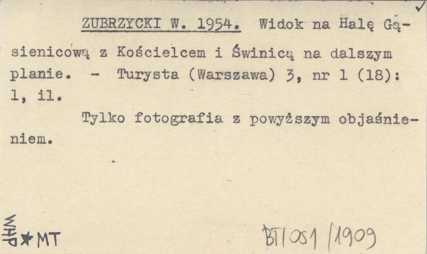 ZUBRZYCKI W. 1954 Widok na Halę Gąsienicową z Kościelcem i Świnicą na dalszym planie.