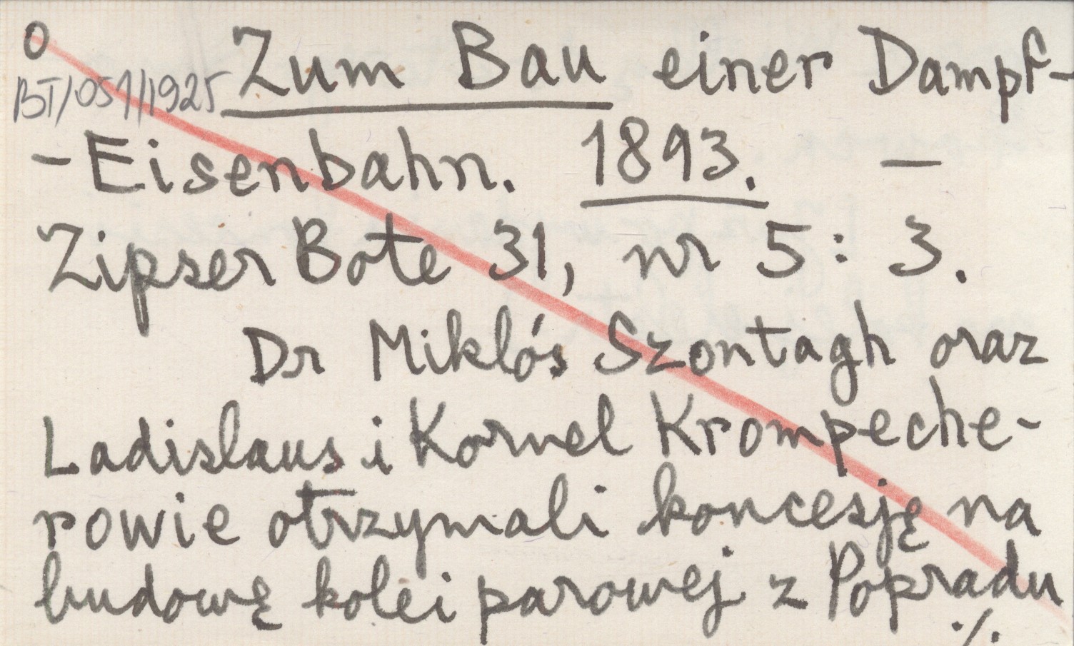 Zipser Bote, 31, nr 5: 3. Dr Miklós Szontagh oraz Ladislaus i Kornel Krompecherowie otrzymali koncesję na budowę kolei parowej z Popradu przez Wielką do Starego Smokowca. [Już po wydaniu koncesji na kolej elektryczną.]