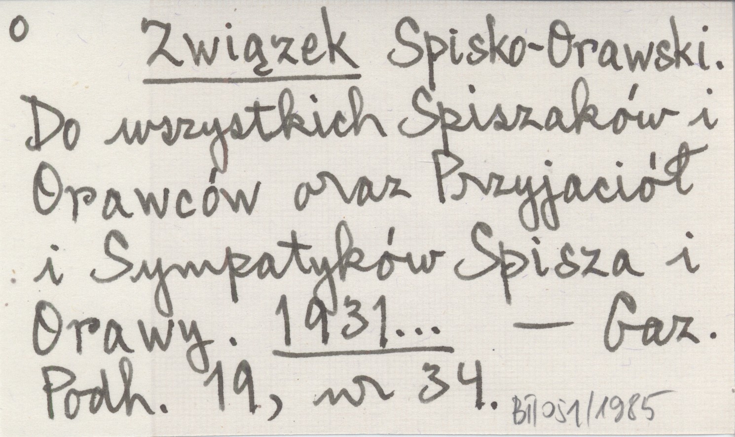 Związek Spisko-Orawski. Do wszystkich Spiszaków i Orawców oraz Przyjaciół i Sympatyków Spisza i Orawy. 1931...