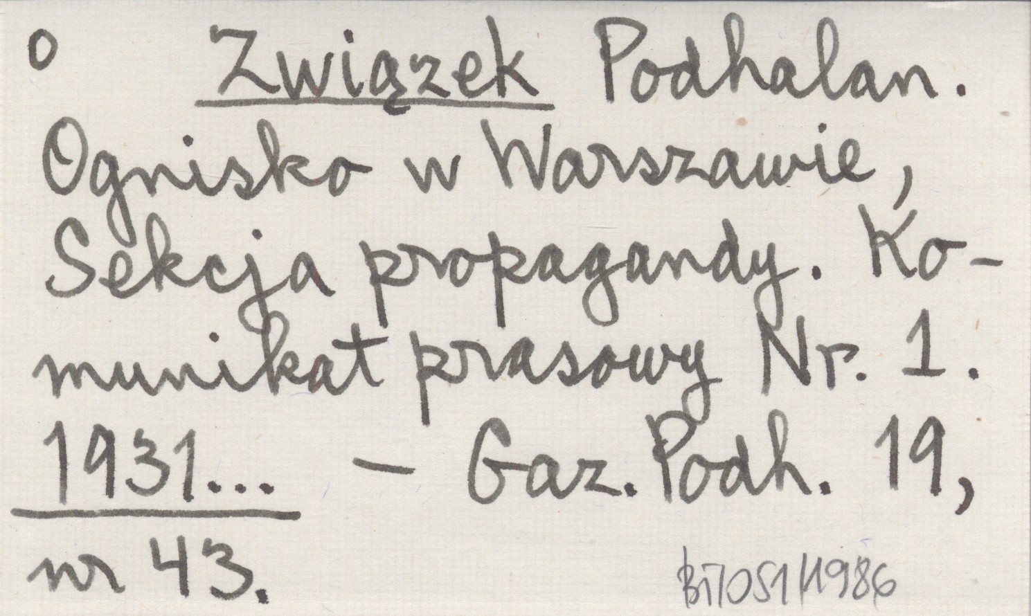 Związek Podhalan. Ognisko w Warszawie, Sekcja propagandy. Komunikat prasowy Nr. 1. 1931...