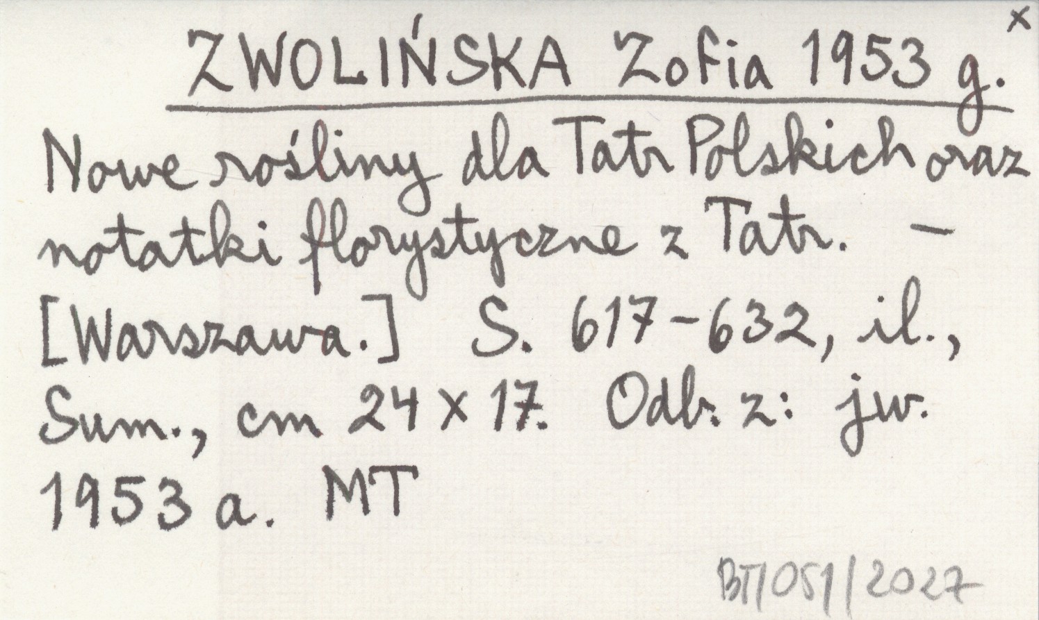 ZWOLIŃSKA Zofia 1953 g Nowe rośliny dla Tatr Polskich oraz notatki florystyczne z Tatr.