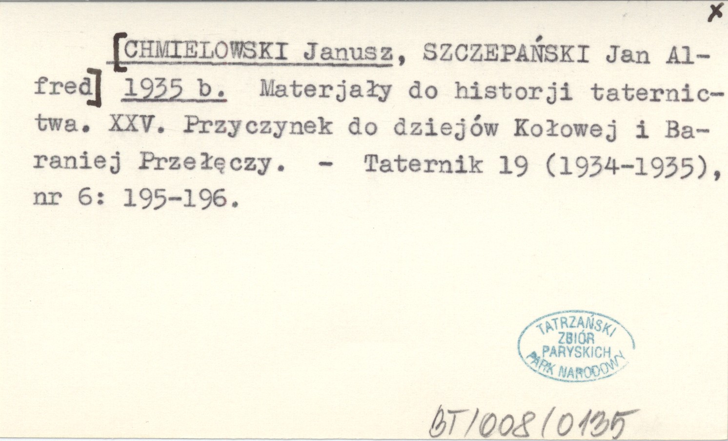 [CHMIELOWSKI Janusz] [SZCZEPAŃSKI, Jan Alfred. ] 1935 b Materjały do historji taternictwa. XXV. Przyczynek do dziejów Kołowej i Baraniej Przełęczy.