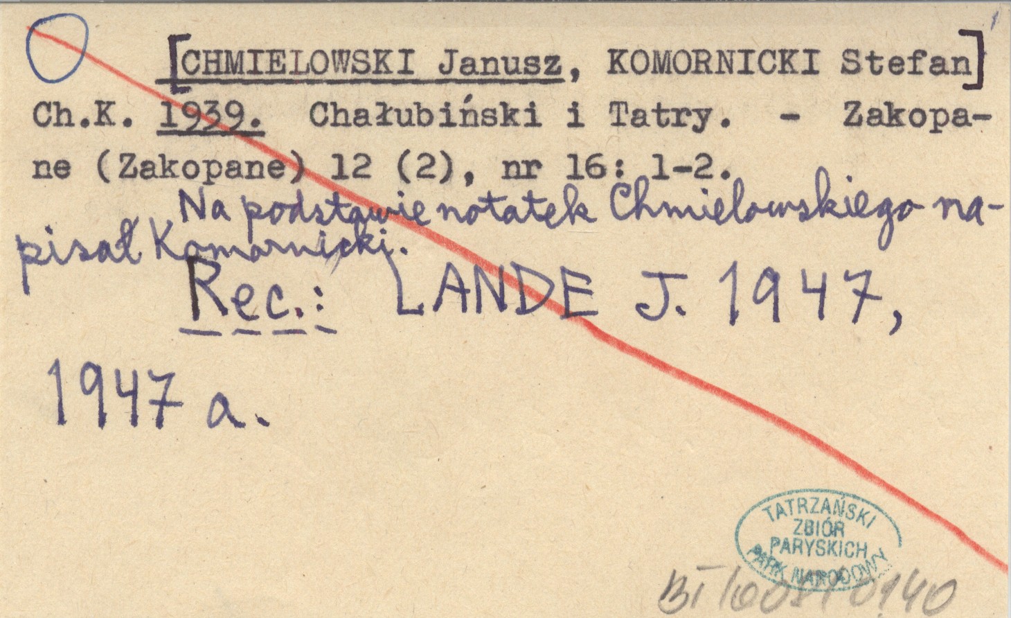 Zakopane (Zakopane) , 12 (2), nr 16: 1-2. Na podstawie notatek Chmielowskiego napisał Komornicki. REC: LANDE J. 1947, 1947 a