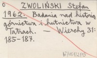 ZWOLIŃSKI Stefan 1962 a Badania nad historią górnictwa i hutnictwa w Tatrach Polskich.