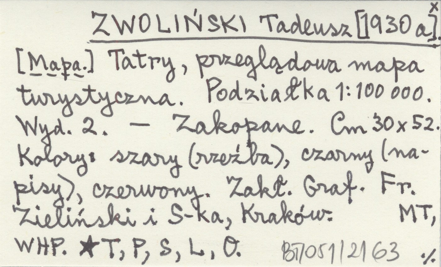 WYD: 2 Zakopane , 30x52 cm. Kolory: szary (rzeźba), czarny (napisy), czerwony. Zakł. Graf. Fr. Zieliński i S-ka, Kraków. Załącznik do ZWOLIŃSKI T. 1930. Mapa ta poza doborem kolorów jest chyba identyczna z mapą ZWOLIŃSKI T. 1927 b.