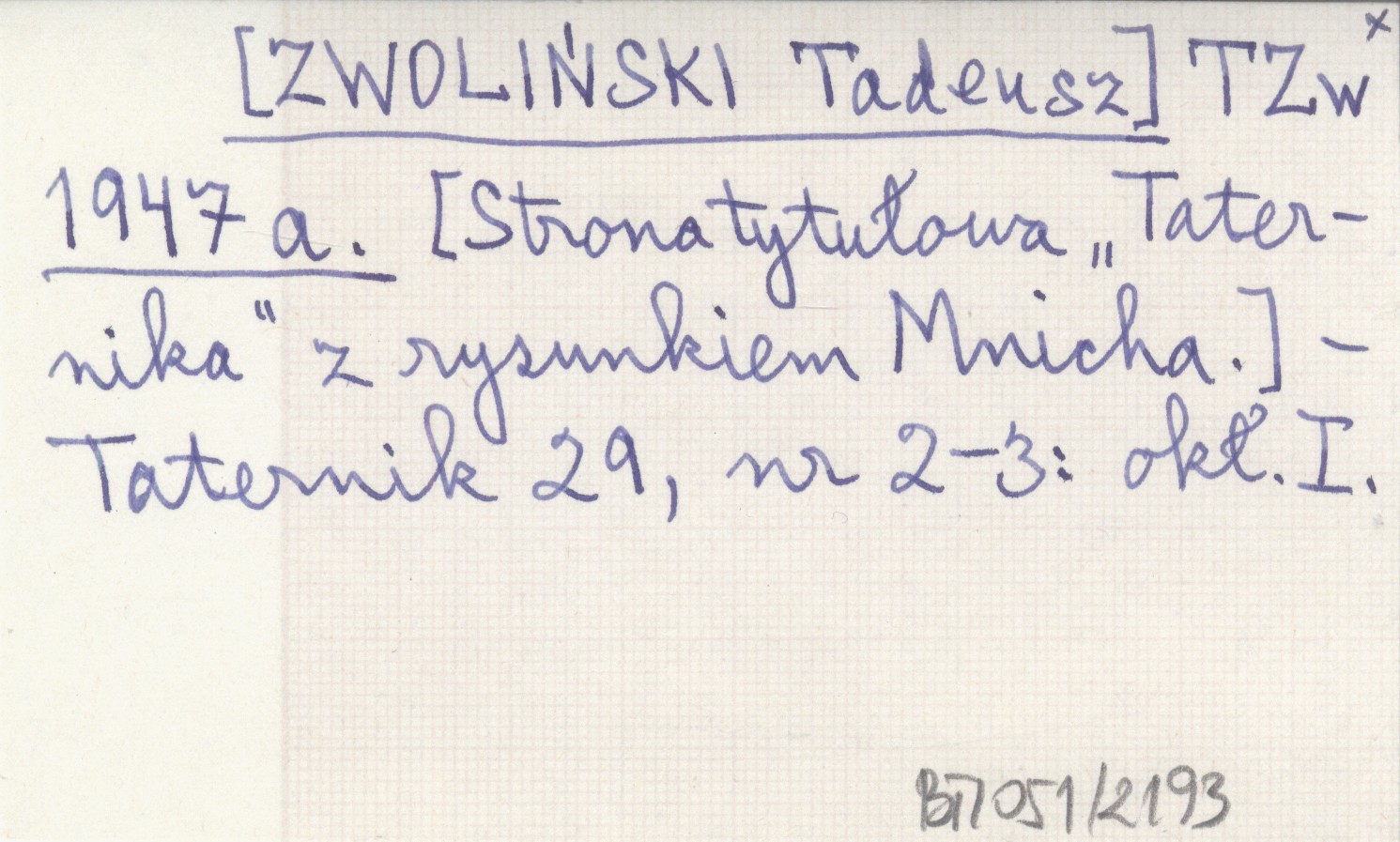 TZw [ZWOLIŃSKI Tadeusz] 1947 a [Strona tytułowa "Taternika" z rysunkiem Mnicha.]