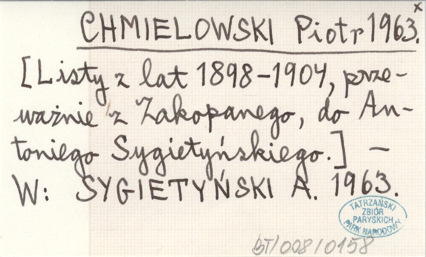 CHMIELOWSKI Piotr 1963 [Listy z lat 1898-1904, przeważnie z Zakopanego, do Antoniego Sygietyńskiego.]