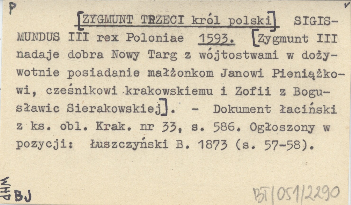 SIGISMUNDUS III rex Poloniae [ZYGMUNT TRZECI, król polski] 1593 [Zygmunt III nadaje dobra Nowy Targ z wójtostwami w dożywotnie posiadanie małżonkom Janowi Pieniążkowi, cześnikowi krakowskiemu i Zofii z Bogusławic Sierakowskiej.]
