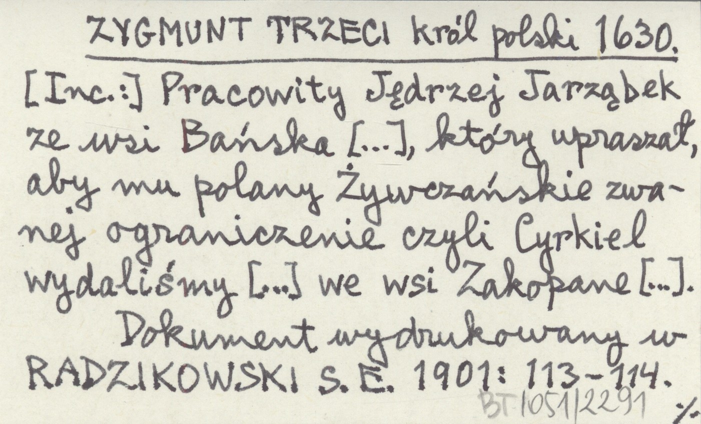 ZYGMUNT TRZECI król polski 1630 [Inc.:] Pracowity Jędrzej Jarząbek ze wsi Bańska [...], który upraszał, aby mu polany Żywczańskie zwanej ograniczenie czyli Cyrkiel wydaliśmy [...] we wsi Zakopane [...].