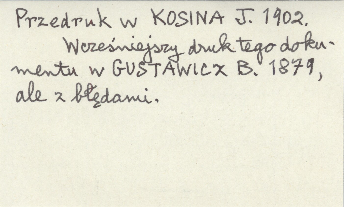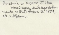 , Dokument wydrukowany w RADZIKOWSKI S. E. 1901: 113-114. Przedruk w KOSINA J. 1902. Wcześniejszy druk tego dokumentu w GUSTAWICZ B. 1879, ale z błędami.