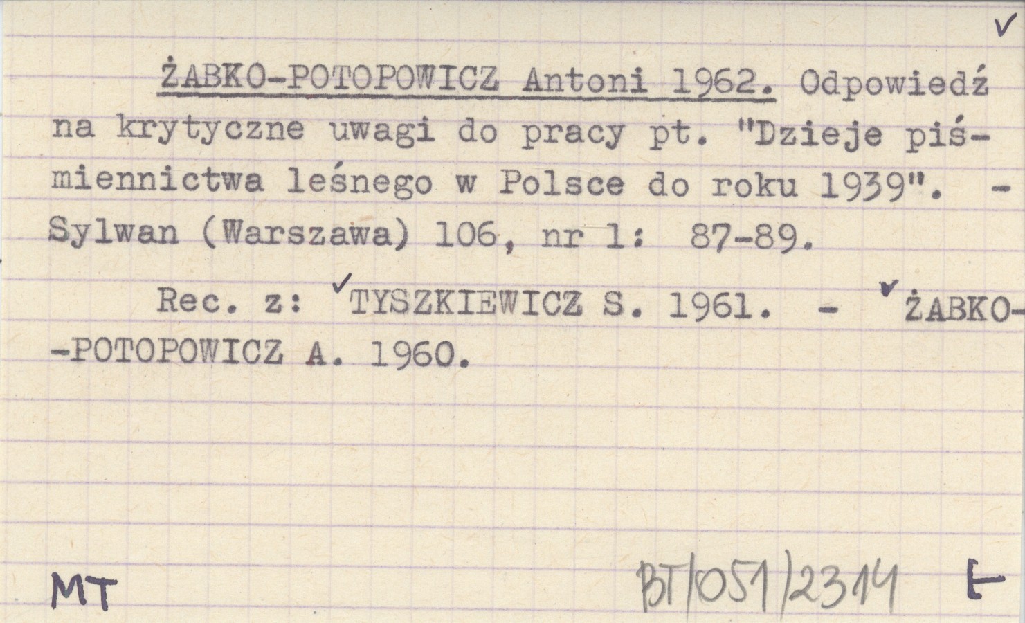 ŻABKO-POTOPOWICZ Antoni 1962 Odpowiedź na krytyczne uwagi do pracy pt. "Dzieje piśmiennictwa leśnego w Polsce do roku 1939".