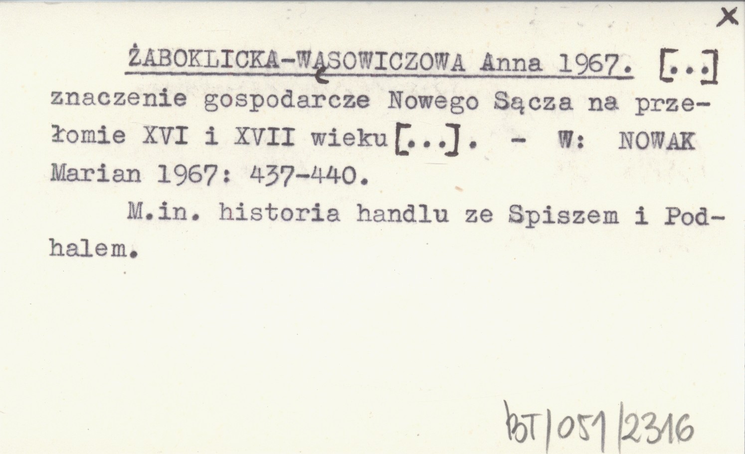 ŻABOKLICKA-WĄSOWICZOWA Anna 1967 [...] znaczenie gospodarcze Nowego Sącza na przełomie XVI i XVII wieku [...].