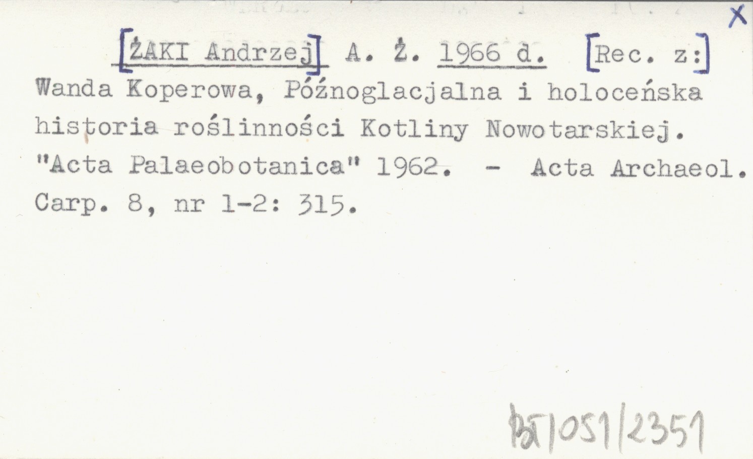 A. Ż. [ŻAKI Andrzej] 1966 d [Rec. z:] Wanda Koperowa, Późnoglacjalna i holoceńska historia roślinności Kotliny Nowotarskiej. "Acta Palaeobotanica" 1962.