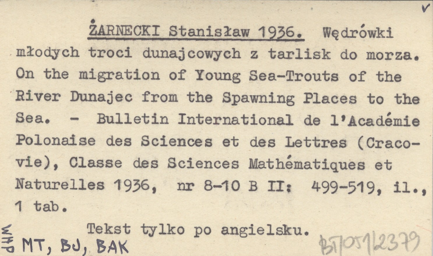 ŻARNECKI Stanisław 1936 Wędrówki młodych troci dunajcowych z tarlisk do morza. On the migration of Young Sea-Trouts of the River Dunajec from the Spawning Places to the Sea.
