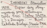 ŻARNECKI Stanisław 1958 Ciężar ikry otrzymywanej przy sztucznym tarle troci (Salmo trutta L.) z Dunajca.