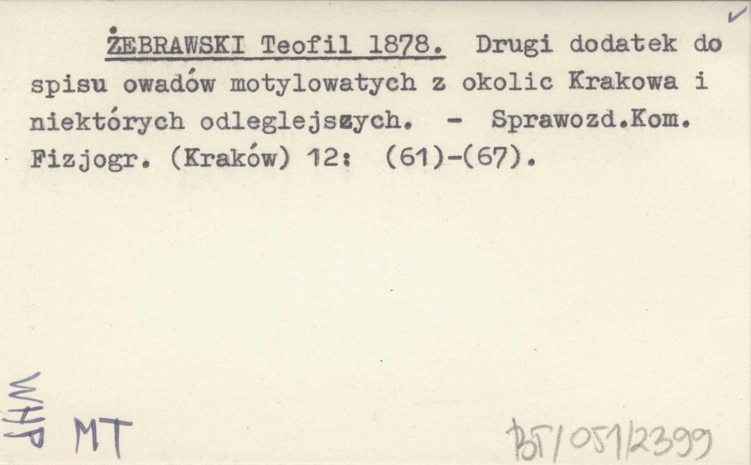 ŻEBRAWSKI Teofil 1878 Drugi dodatek do spisu owadów motylowatych z okolic Krakowa i niektórych odleglejszych.