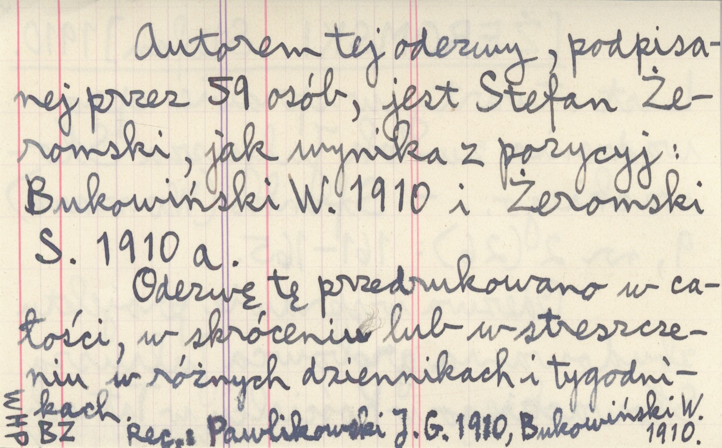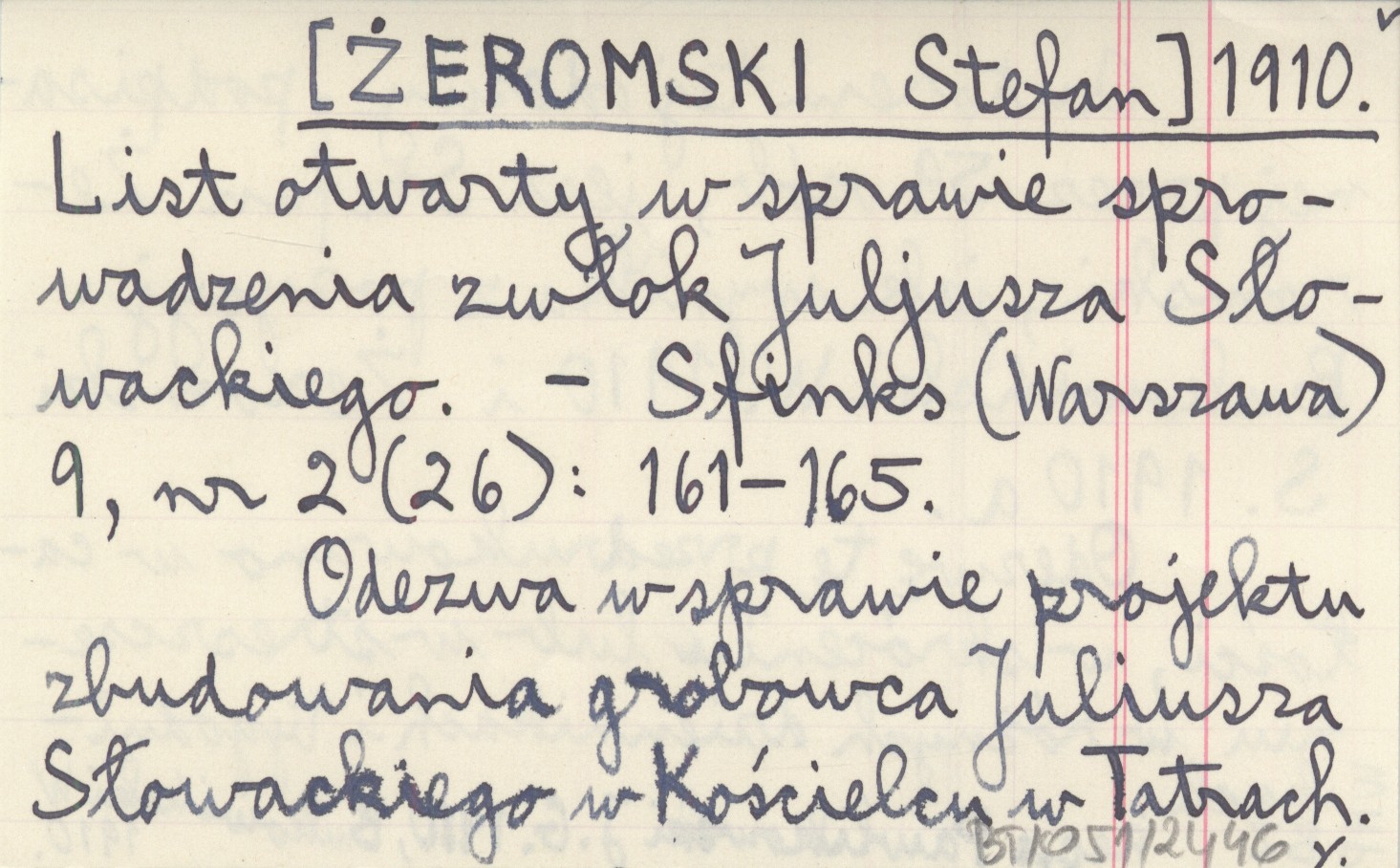 Sfinks (Warszawa) , 9, nr 2 (26): 161-165. Odezwa w sprawie projektu zbudowania grobowca Juliusza Słowackiego w Kościelcu w Tatrach. Autorem tej odezwy, podpisanej przez 59 osób, jest Stefan Żeromski, jak wynika z pozycji: BUKOWIŃSKI W. 1910 i ŻEROMSKI S. 1910 a. Odezwę tę przedrukowano w całości, w skróceniu lub w streszczeniu w różnych dziennikach i tygodnikach. REC: PAWLIKOWSKI J. G. 1910 ; BUKOWIŃSKI W. 1910 ;