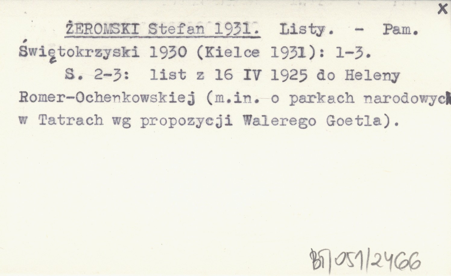 Pamiętnik Świętokrzyski, 1930 (Kielce 1931): 1-3. S. 2-3: list z 16 IV 1925 do Heleny Romer-Ochenkowskiej (m. in. o parkach narodowych w Tatrach wg propozycji Walerego Goetla).