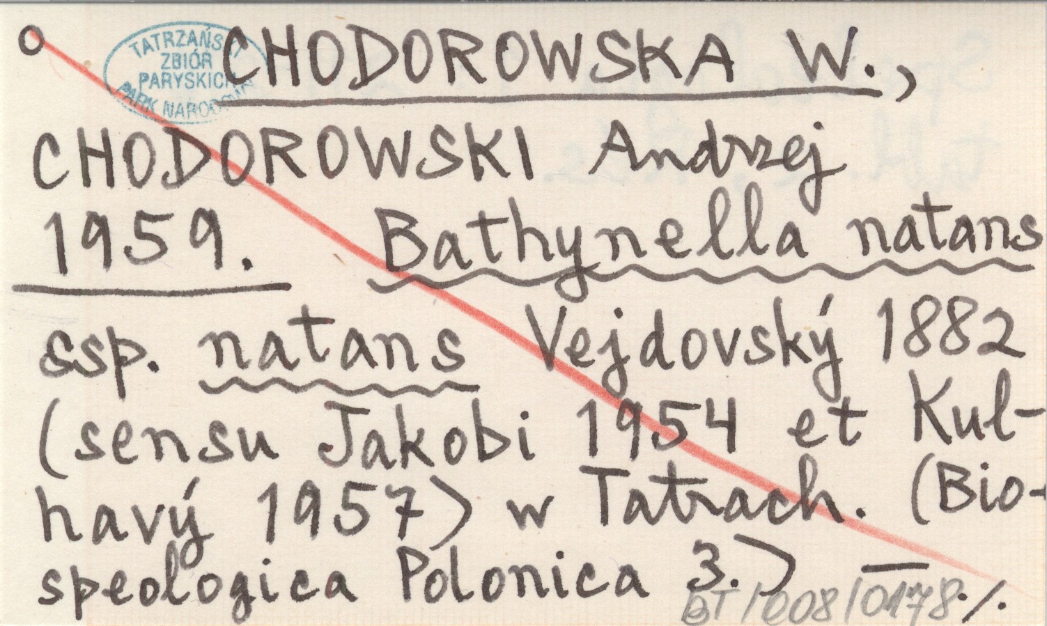 CHODOROWSKA W. CHODOROWSKI, Andrzej. ; 1959 Bathynella natans ssp. natans Vejdovský 1882 (sensu Jakobi 1954 et Kulhavý 1957) w Tatrach. (Biospeologica Polonica 3).