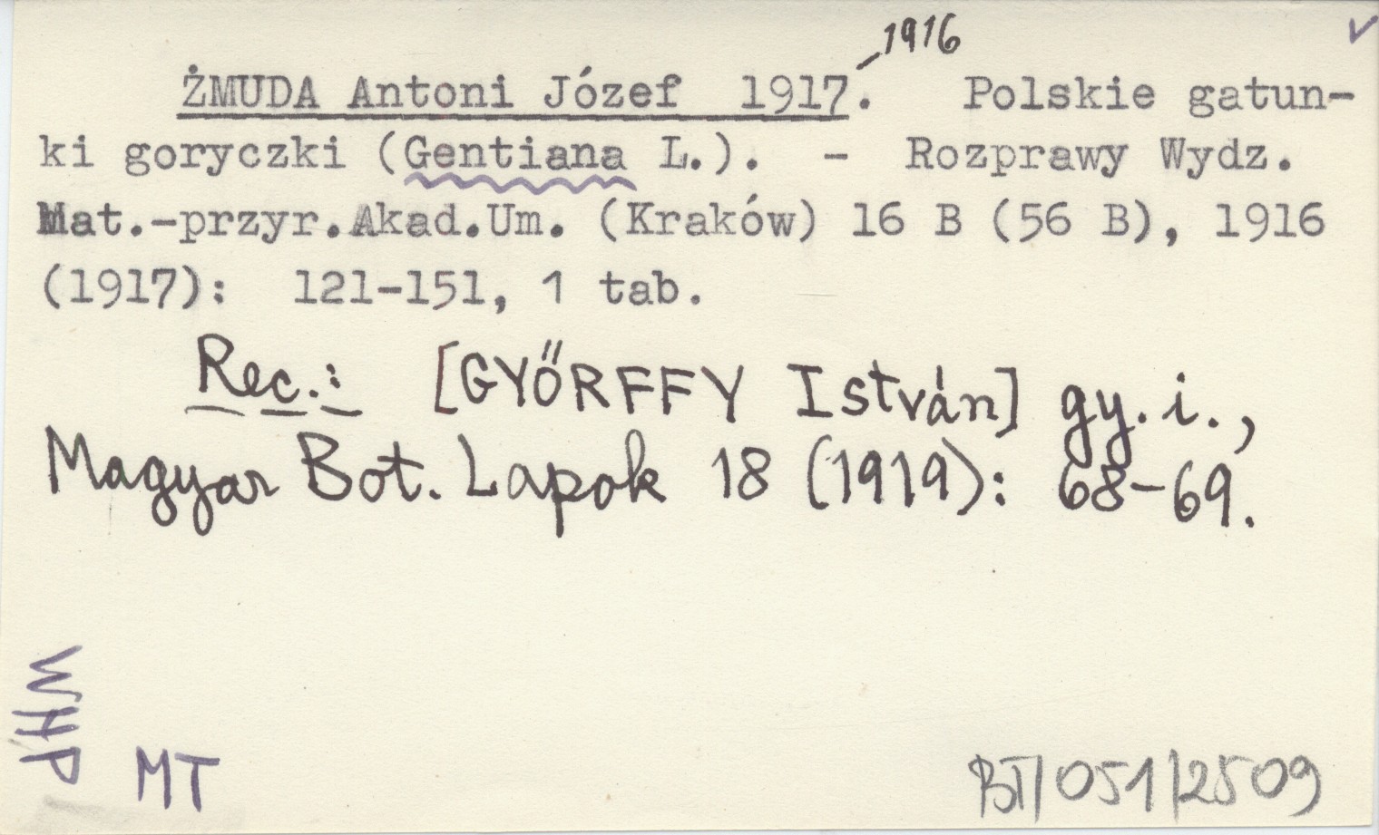 ŻMUDA Antoni Józef 1916 (1917) Polskie gatunki goryczki (Gentiana L.).