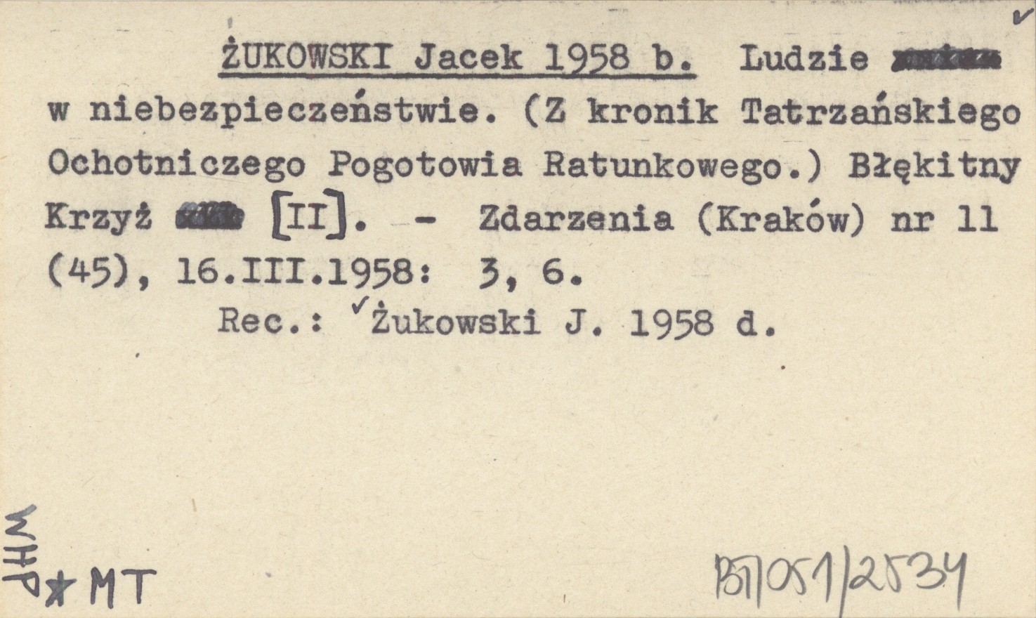 ŻUKOWSKI Jacek 1958 b Ludzie w niebezpieczeństwie. (Z kronik Tatrzańskiego Ochotniczego Pogotowia Ratunkowego). Błękitny Krzyż (II).