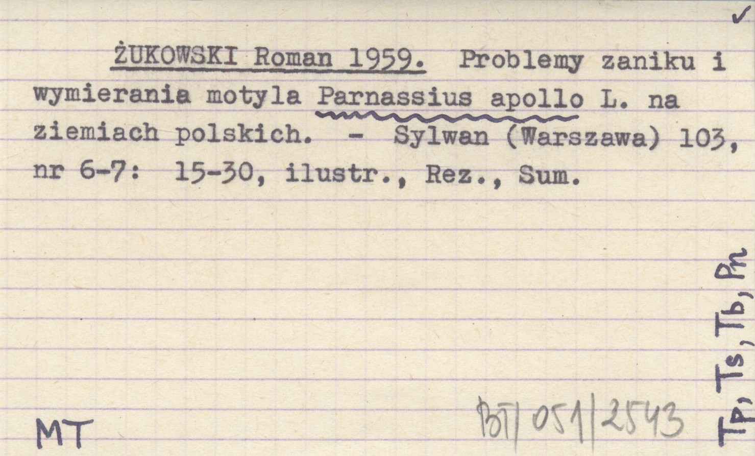 ŻUKOWSKI Roman 1959 Problemy zaniku i wymierania motyla Parnassius apollo L. na ziemiach polskich.