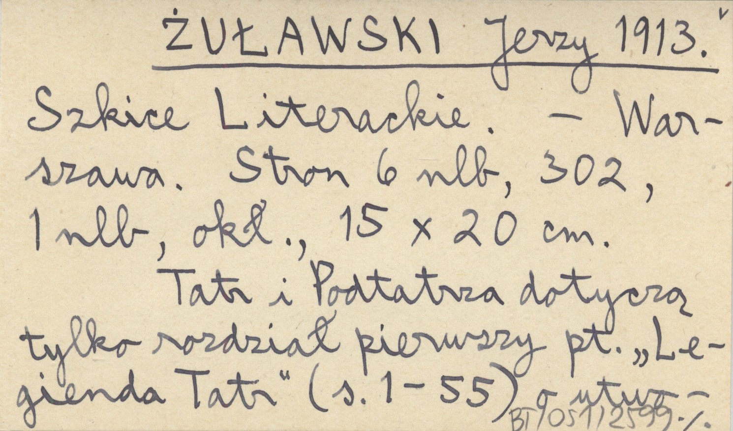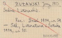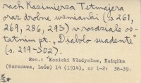 Warszawa , [6], 302, [1] s., okł., 15x20 cm. Tatr i Podtatrza dotyczą tylko rozdział pierwszy pt. "Legienda Tatr" (s. 1-55) o utworach Kazimierza Tetmajera oraz drobne wzmianki (s. 261, 269, 286, 293) w rozdziale ostatnim pt. "Diabolo suadente" (s. 219-302). REC: KOZICKI Władysław, Książka (Warszawa, Lwów) 14 (1914), nr 1-2: 38-39 ; Dzień 1914, nr 59 ; Sdl., Literatura i Sztuka 1914, nr 10 ;