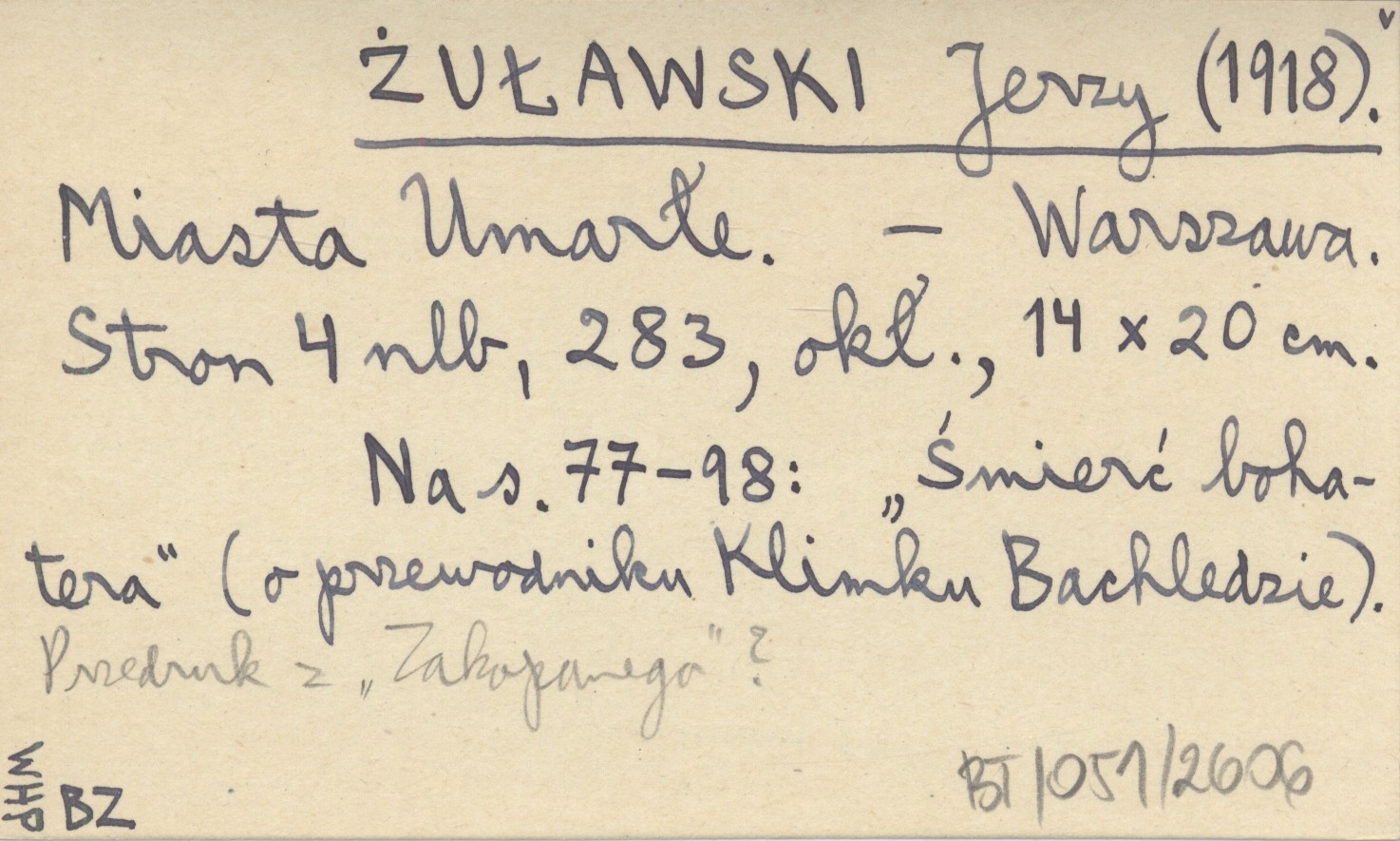 Warszawa , [4], 283 s., okł., 14x20 cm. Na s. 77-98: "Śmierć bohatera" (o przewodniku Klimku Bachledzie). Przedruk z "Zakopanego"?