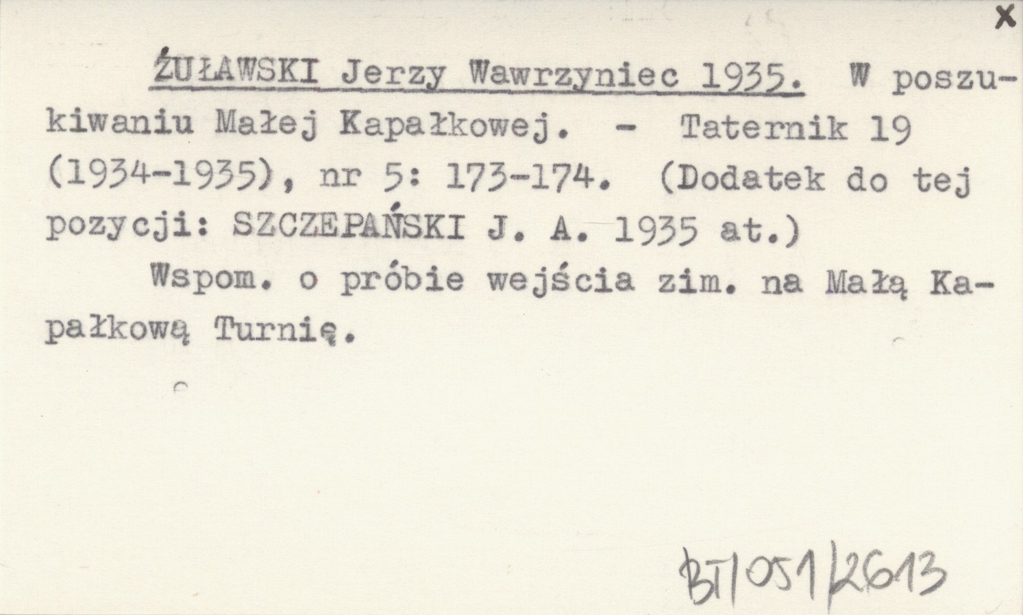 Taternik, 19 (1934-1935), nr 5: 173-174. Wspomnienie o próbie wejścia zimowego na Małą Kapałkową Turnię. Dodatek do tej pozycji: SZCZEPAŃSKI J. A. 1935 at.