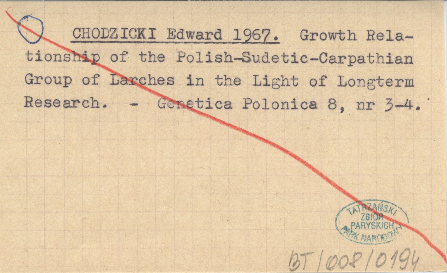 CHODZICKI Edward 1967 Growth Relatioship of the Polish-Sudetic-Carpathian Group of Larches in the Light of Longterm Resarch.