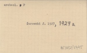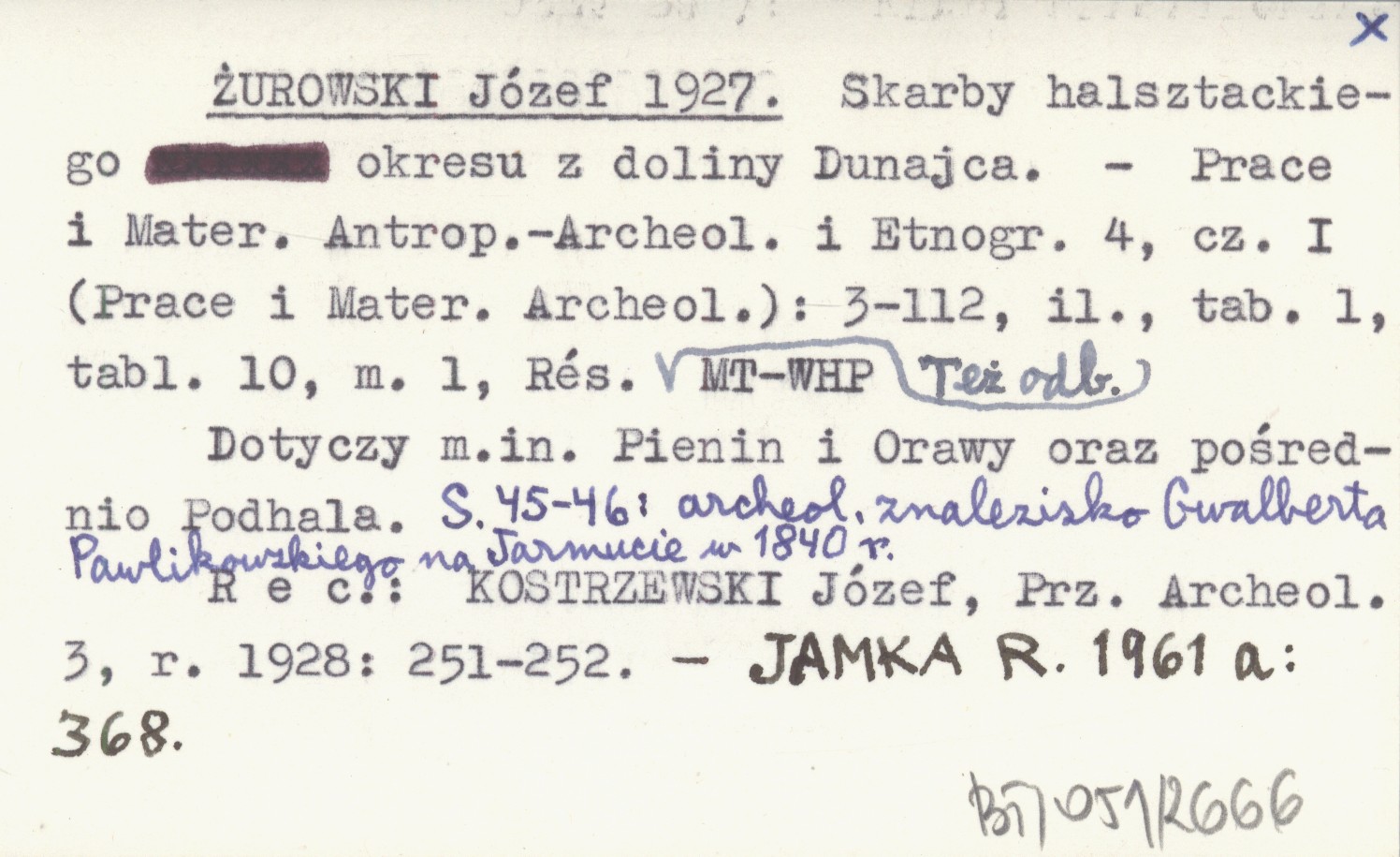 Prace i Materiały Antropologiczno-Archeologiczne i Etnograficzne, 4, cz. I (Prace i Materiały Archeologiczne): 3-112, il., 1, 10 k., 1 mapa, Rés. Dotyczy m. in. Pienin i Orawy oraz pośrednio Podhala. S. 45-46: archeologiczne znalezisko Gwalberta Pawlikowskiego na Jarmucie w 1840 r. Też odb. REC: KOSTRZEWSKI Józef, Przegląd Archeologiczny 3 (1928): 251-252 ; JAMKA R. 1961 a: 368 ;