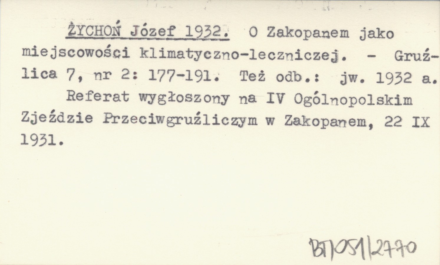 ŻYCHOŃ Józef 1932 O Zakopanem jako miejscowości klimatyczno-leczniczej.