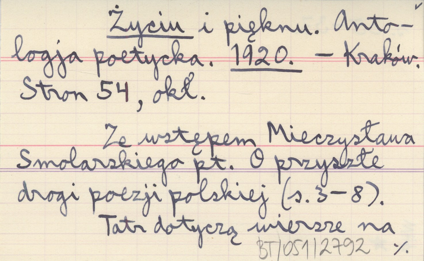 Kraków , 54 s., okł. Ze wstępem Mieczysława Smolarskiego pt. O przyszłe drogi poezji polskiej (s. 3-8). Tatr dotyczą wiersze na s. 35-37.