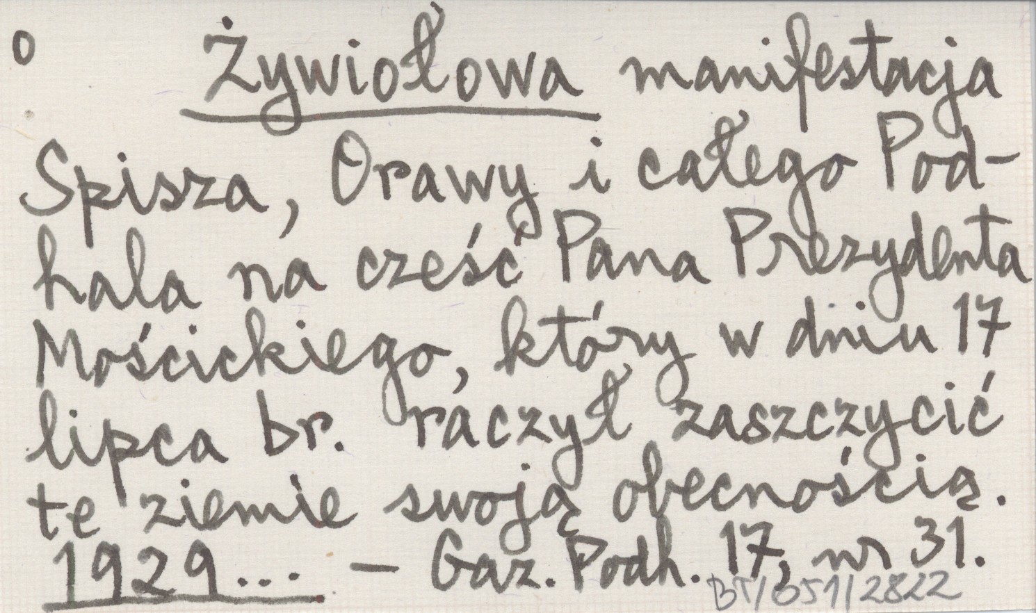 Żywiołowa manifestacja Spisza, Orawy i całego Podhala na cześć Pana Prezydenta Mościckiego, który w dniu 17 lipca br. raczył zaszczycić te ziemie swoją obecnością. 1929...