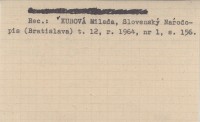 , 60 s., Zsf., 24x17 cm. Bibliografická příloha Zpráv SČN [Společnosti československých národopisců při ČSAV] a [SNS Slovenskej národopisnej spoločnosti pri SAV] č. 5. REC: KUBOVÁ Milada, Slovenský Národopis (Bratislava) t. 12 (1964), nr 1: 156.