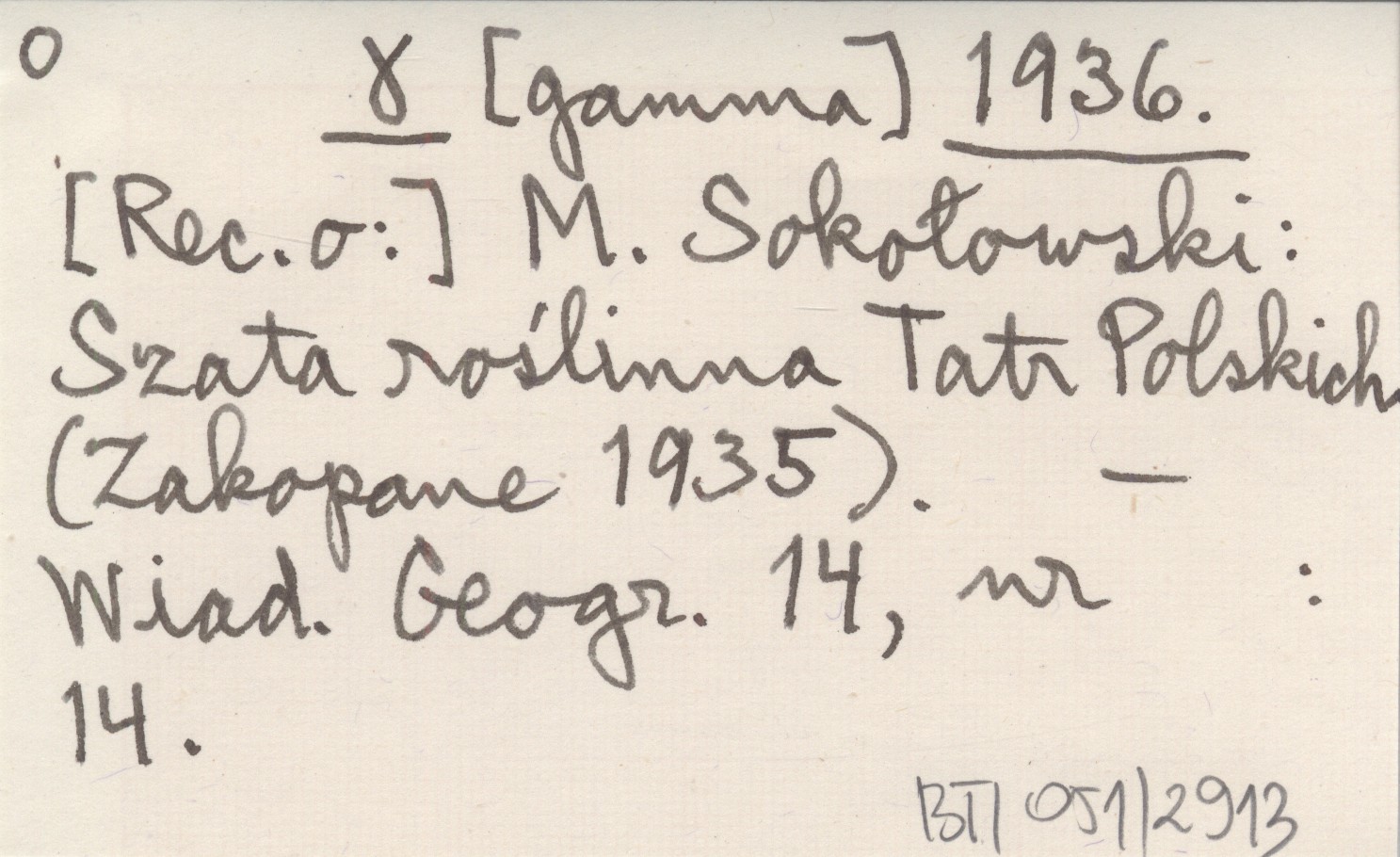 1936 [Rec. o:] M. Sokołowski: Szata roślinna Tatr Polskich (Zakopane 1935).