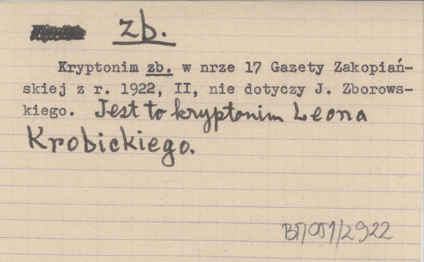 , Kryptonim zb. w nr 17 Gazety Zakopiańskiej z r. 1922, II, nie dotyczy J. Zborowskiego. Jest to kryptonim Leona Krobickiego.