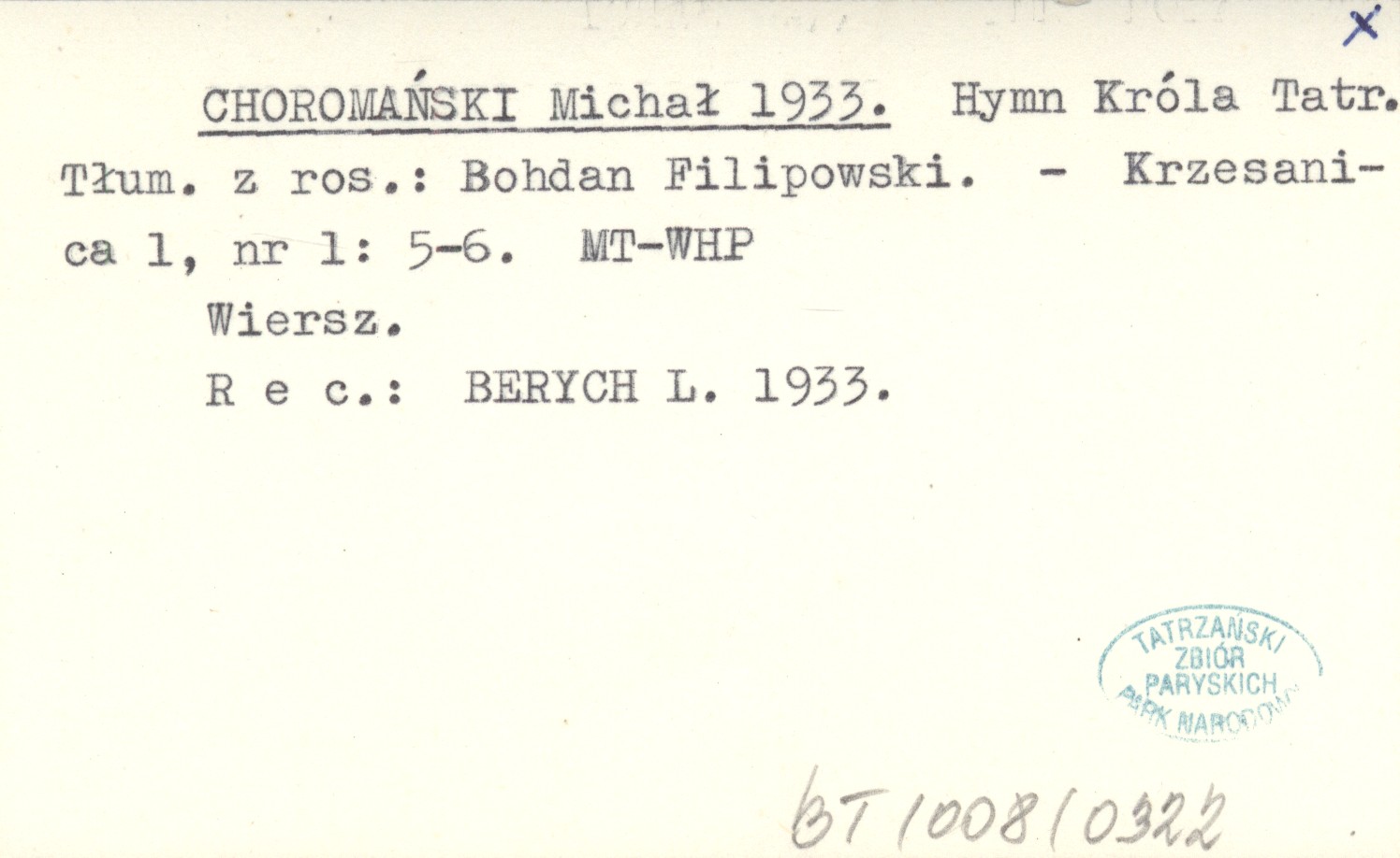 Krzesanica, 1, nr 1: 5-6. Wiersz. Tłum. z ros.: Bohdan Filipowski. REC: BERYCH L. 1933