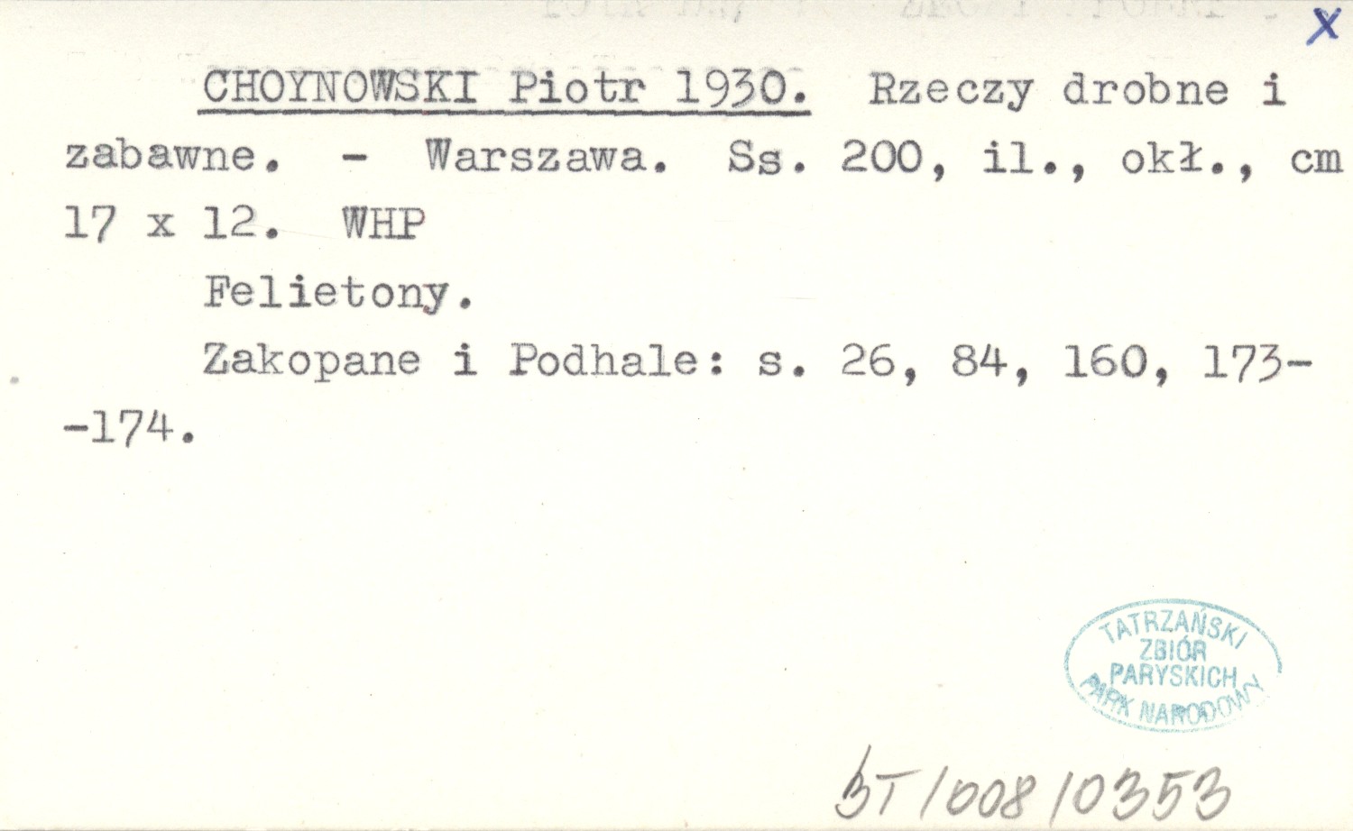 Warszawa , 200 s., il. okł., 17x12 cm. Felieton. Zakopane i Podhale: s. 26, 84, 160, 173-174.