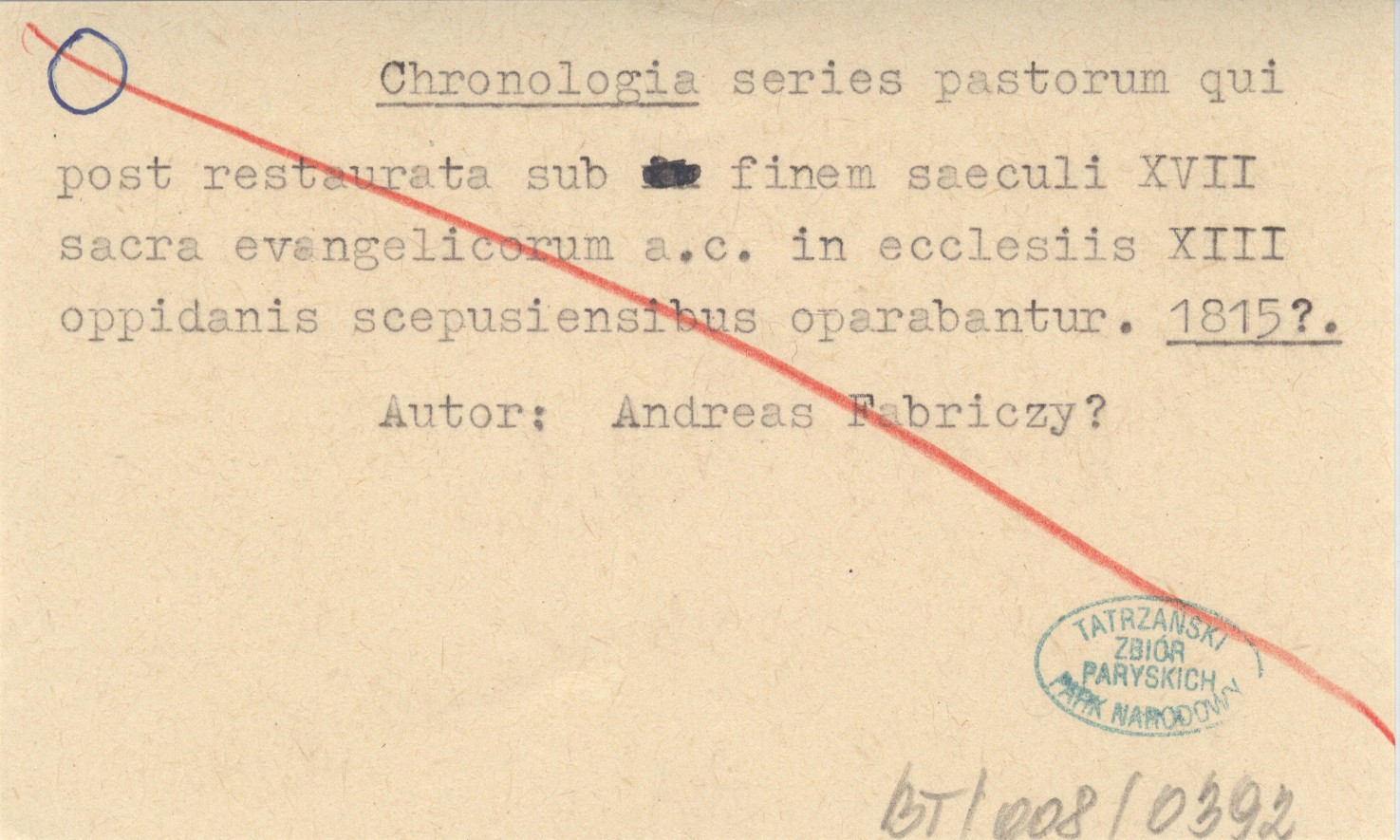 Chronologia series pastorum qui post restaurata sub finem saeculi XVII sacra evangelicorum a. c. in ecclesiis XIII oppidanis sciepusiensibus oparabantur. 1815?